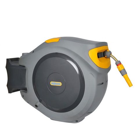 Väggmonterad slangvinda med automatisk reglerad indragning. Perfekt för den stora trädgården.