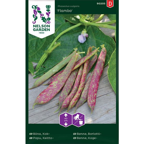 Vacker böna, ibland kallad borlottoböna, med dekorativa baljor i rosa och vitt. Mogna baljor kan torkas och bönorna användas som kokbönor. Späda baljor kan kokas och ätas som brytbönor. Trivs bäst i väldränerad, mullrik och fuktighetshållande jord i skyddat läge. Vattna rikligt.