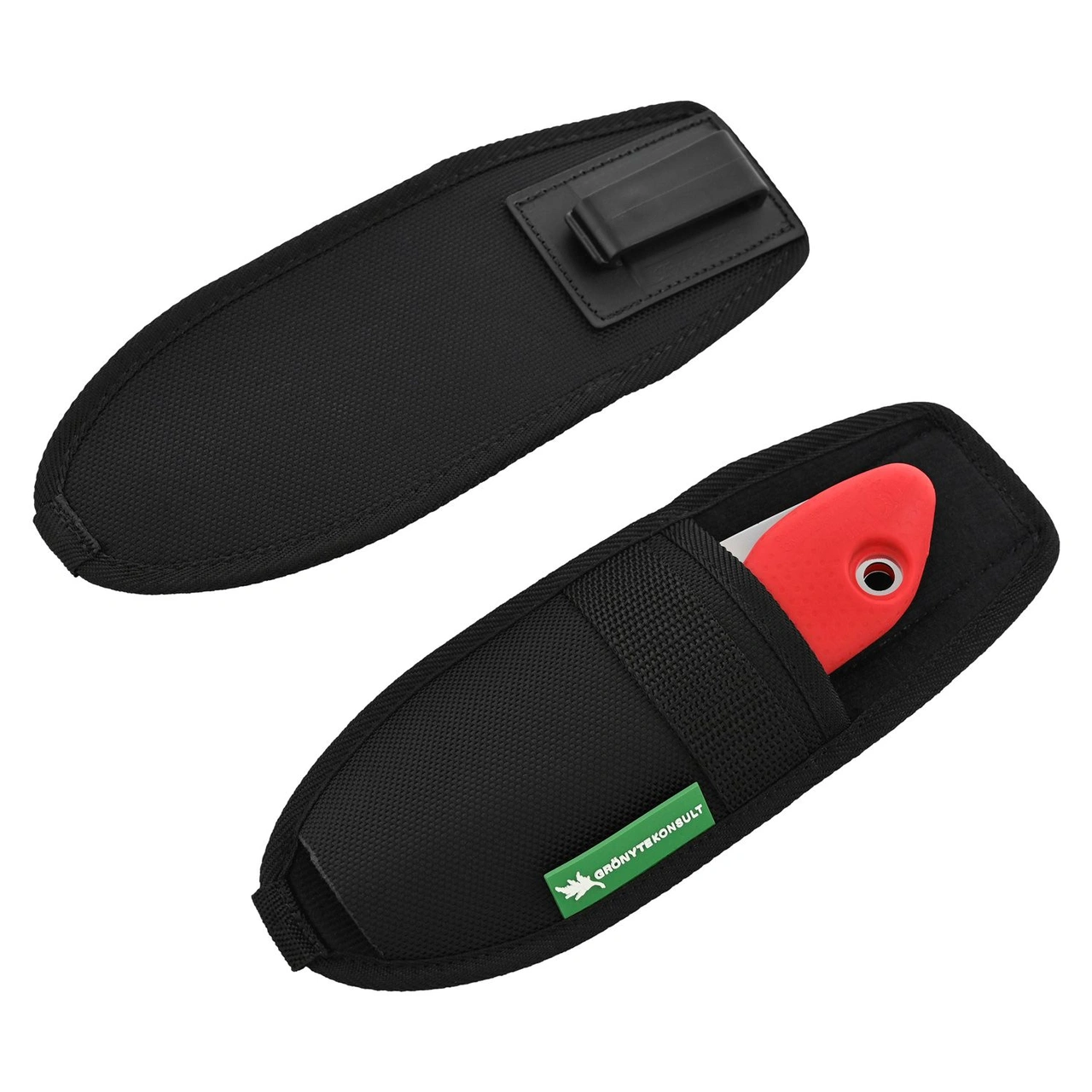 Hake på baksidan som enkelt fästes i ficka, i linning eller på ett bälte max (4,5 cm brett).Tillverkad i Sverige.