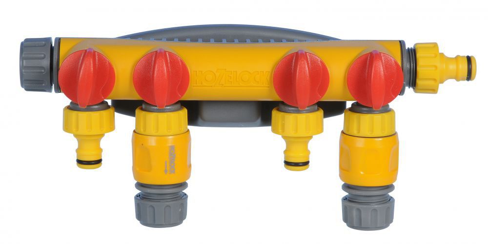 Krankoppling som låter vattenflödet delas till 4 vägar. Vatteninloppet kan man välja att ha till höger eller vänster. Går även att koppla på en bevattningstimer.