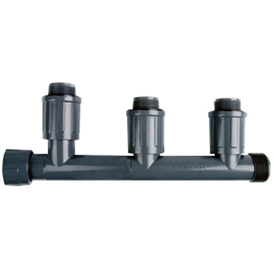 Fördelare med tre avstick, R25utv x inv + 3xR25utv. Flera fördelare kan sammankopplas och/eller kombineras med andra unionskopplingar.