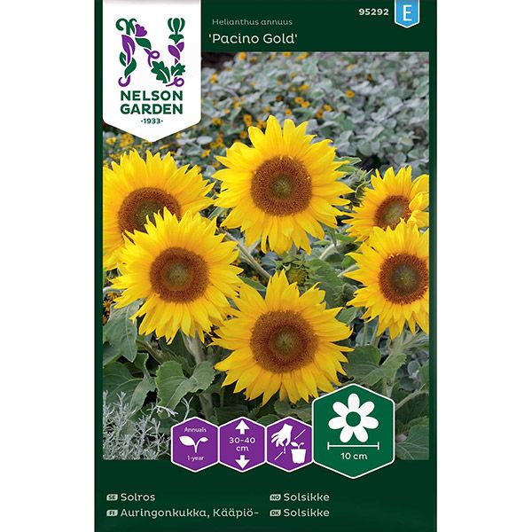 Solros - Pacino Gold är en lysande solgul solros, lämplig för odling i kruka. Sorten ger en låg planta med fin förgrening och många tidiga 10cm stora blommor. Vacker i större krukor och i rabatten. Lätt och tacksam att förkultivera för tidig blomning. Trivs på de flesta jordar.