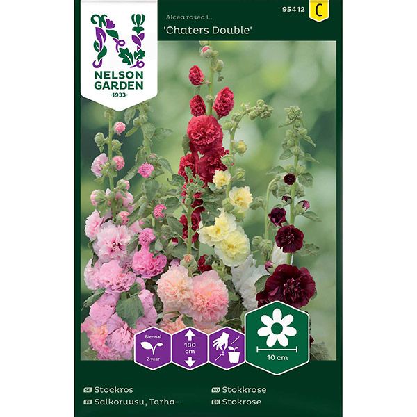Stockros - Chaters Double ger fyllda, pionliknande, 10cm stora blommor i vitt, gult, rosa och mörkrött. Stockros blommar normalt året efter sådd, men kan vid tidig sådd blomma samma år (är då 1-årig). Flerårigheten kan stimuleras genom att blomstängeln skärs av innan sista blomman vissnat. Blötlägg fröna ett dygn före sådd så gror de snabbare. Trivs i näringsrik jord.