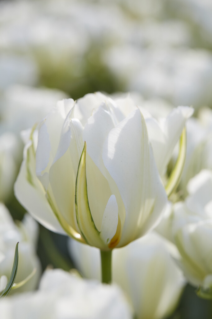 Tidig dubbel tulpan. Vackert snövit tulpan med gröna strimmor.