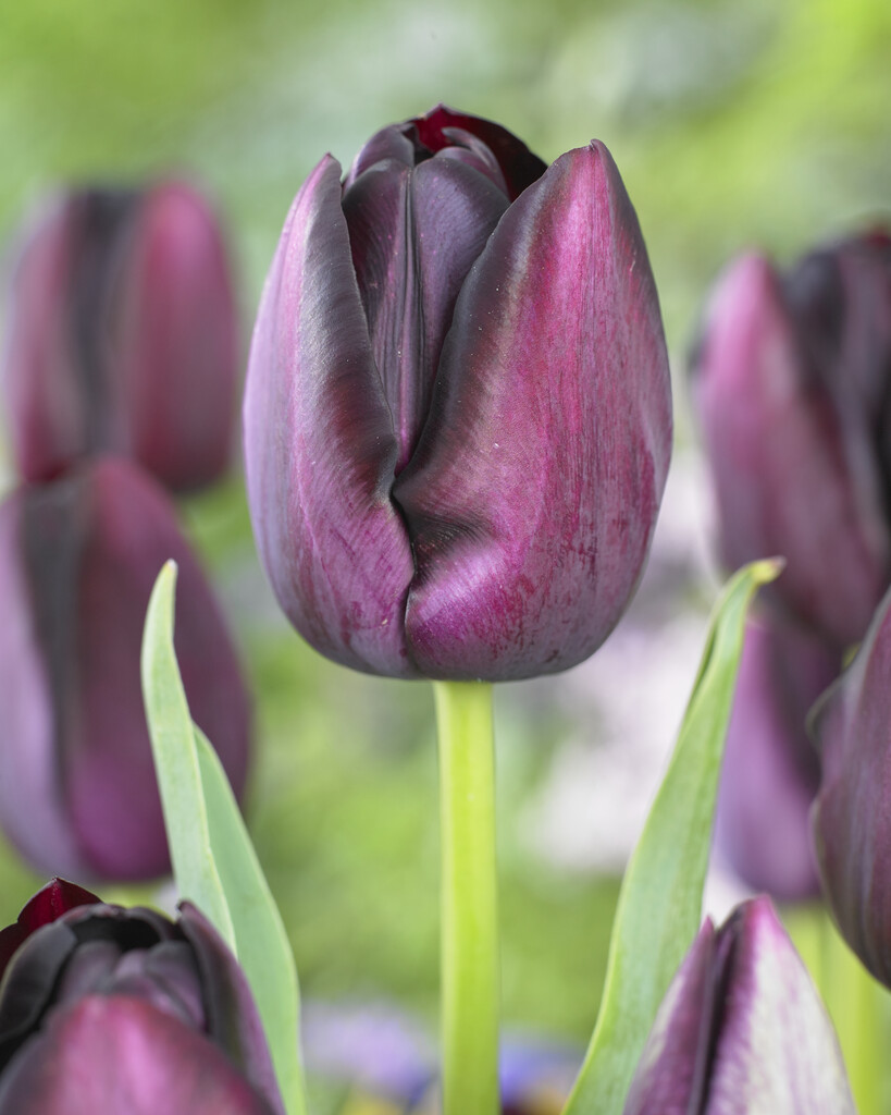 Sen enkeblommande tulpan. Blommar med vackra mörkt purpurfärgade blommor, ser nästan svarta ut.