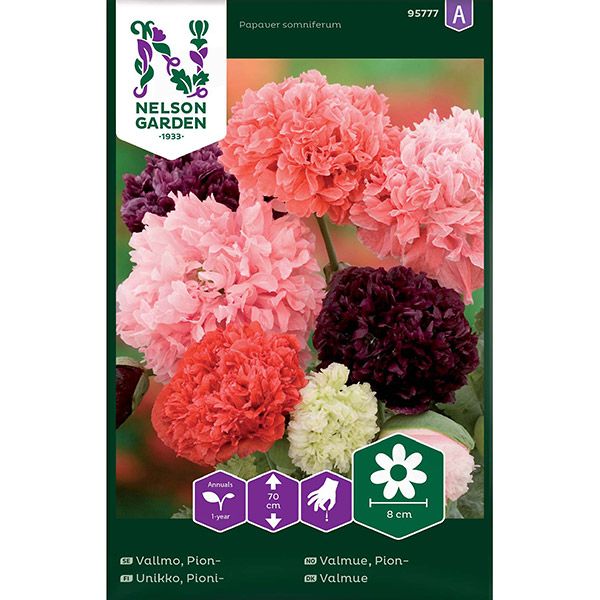 Omtyckt ettårig vallmo som blommar med stora, fyllda, pionliknande blommor. Blandningen innehåller rosa, vita och röda nyanser. Mycket lättodlad rabatt- och snittblomma. Så både höst och vår för att få lång blomningstid. Trivs i de flesta väldränerade jordar. Vattna vid torka.